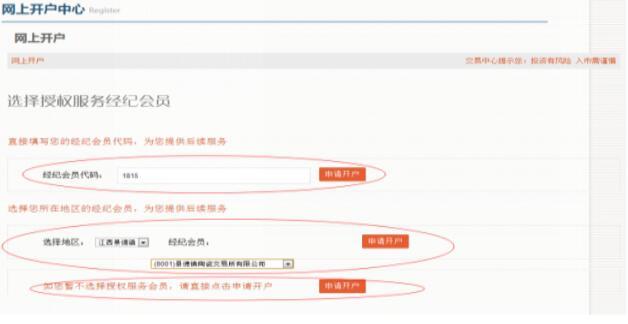 3、點擊“網(wǎng)上開戶”進入選擇:(方式一:若您有為自己服務(wù)的經(jīng)紀會員,可以直接輸入代碼,點擊申請開戶;方式二:自行選擇經(jīng)紀會員,點擊選擇地區(qū),選擇經(jīng)紀會員,申請開戶;方式三:直接點擊申請開戶)