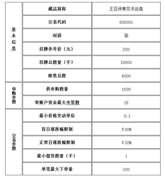 經景德鎮(zhèn)陶瓷交易所有限公司(以下稱本交易所)發(fā)行會員申請,本交易所專家委員會、新藏品掛牌審核小組評估審核通過,對已經完成托管入庫的藏品《王亞洲青花書法盤》準予在本交易所線上實物交易系統(tǒng)正式掛牌交易,具體事項公告如下: